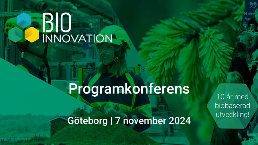 Den 7 november 2024 bjuder det strategiska innovationsprogrammet BioInnovation in till programkonferens där forsknings- och innovationsresultat från hela Sverige presenteras inom framtidens cirkulära och biobaserade material och produkter. I år fyller programmet tio år och det vill vi fira med dig, och under dagen blickar vi både framåt och bakåt på den biobaserade utvecklingen.