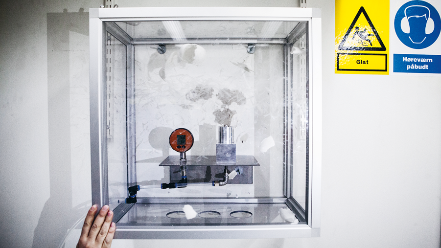 Teknikern stänger luckan till den lilla plexiglasboxen där han satt fast den vita pappersflaskan. Larmet ljuder genom väggar och tak, upp till kontoret ovanför och till produktionslokalerna bredvid, innan det plötsligt smäller så högt att alla närvarande hoppar till.